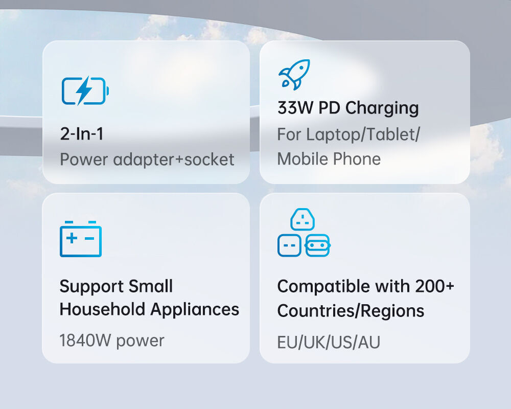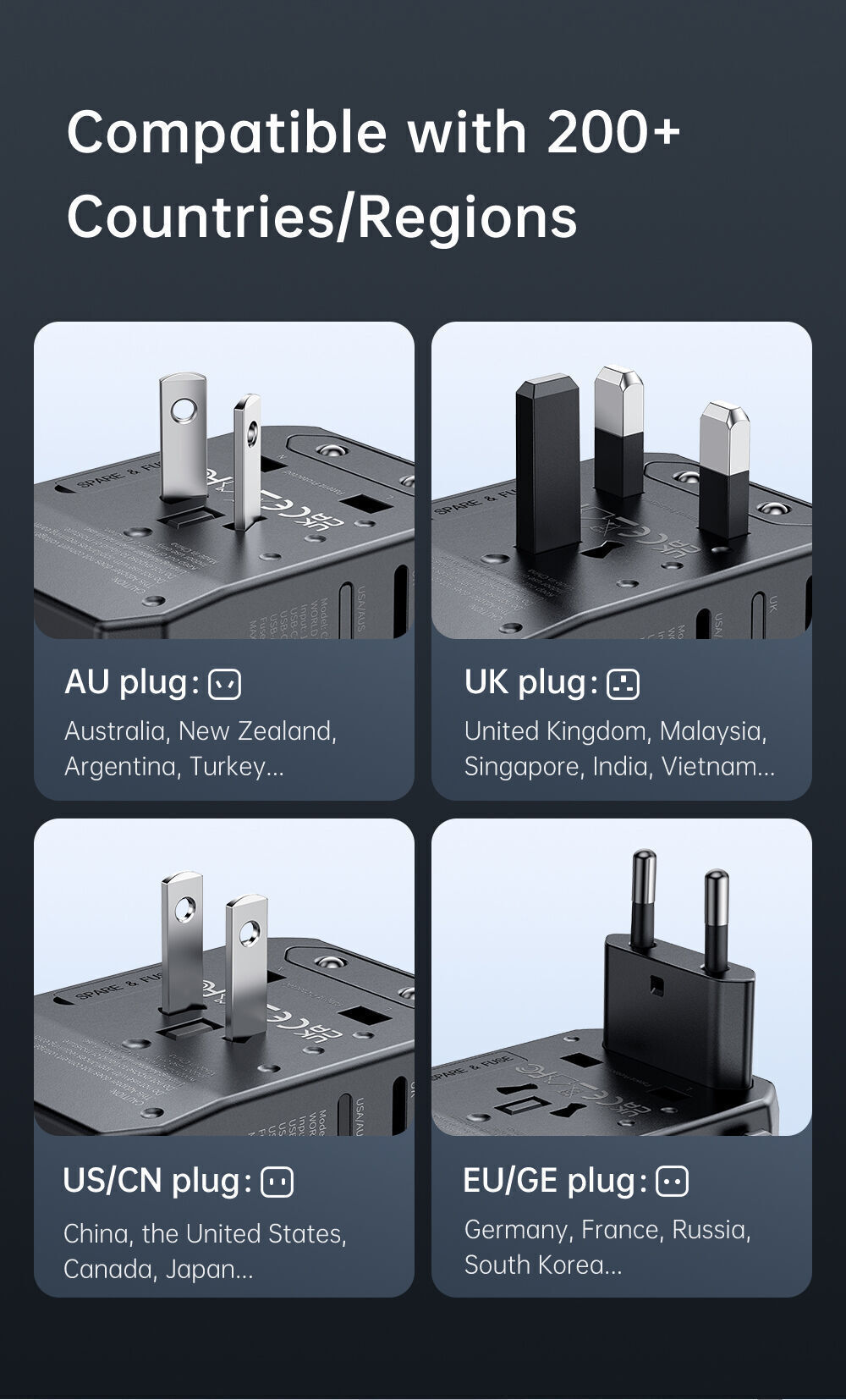 High light1. Universal travel adapter is compatible with outlets in over 200 countries & regions