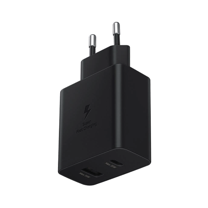 Samsung 35W PD Power Adapter Duo USB-C USB-A Ports Charger. The wall charger offers fast and simultaneous charging to two devices. Samsung says that the brick can charge Android and iPhone smartphones, apart from tablets, laptops, and smartwatches. It is also compatible with wireless chargers. Furthermore, the charger can be used with TWS earbuds and power banks as well. It comes with one USB Type-C and one USB Type-A charging port. Samsung claims that the charger can juice up Galaxy smartphones in 50 percent less charging time.