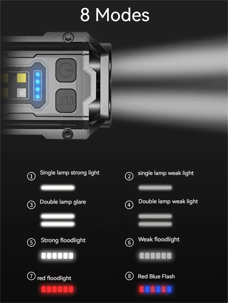 【Easy to Operate】- This light can switch modes by pressing a button (Single lame Strong light,Single lamp Weak light,Double lamp glare,Double lamp Weak Light,Strong Floodlight, Weak Floodlight,Red floodlight,Red Blue flash.