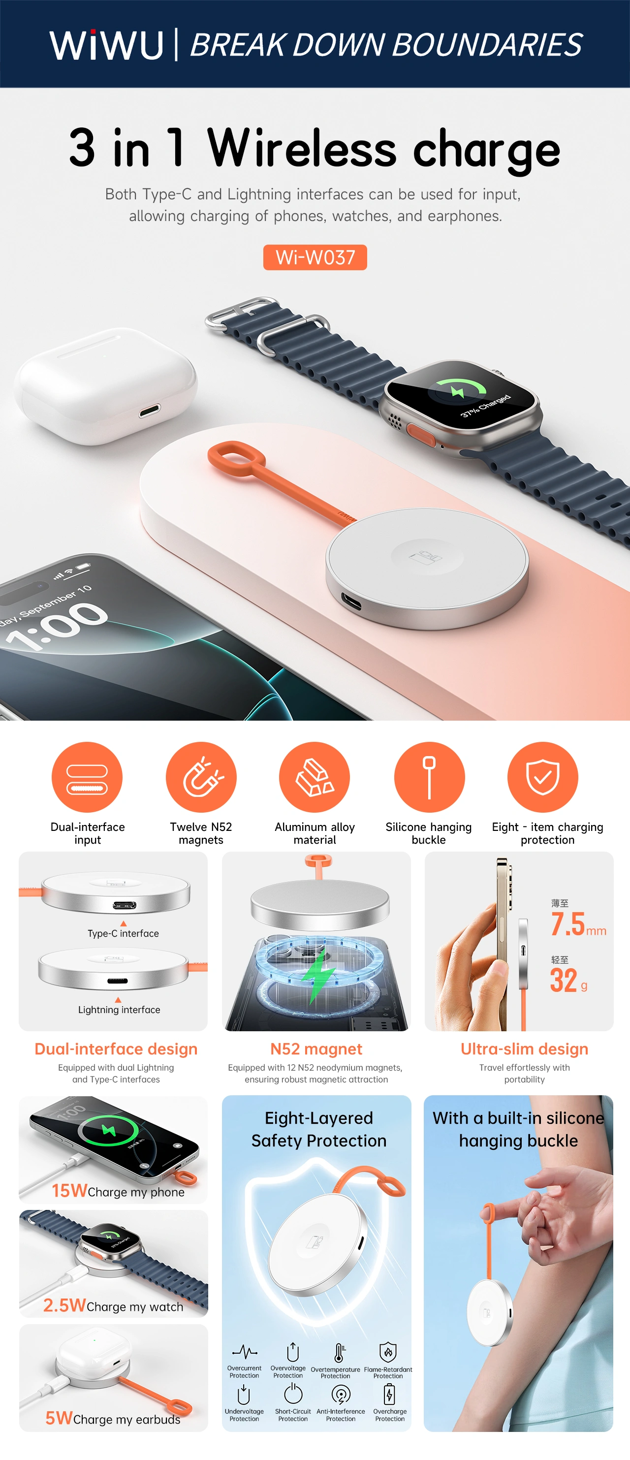 1. Comes with dual input ports C and L, 3-in-1 wireless charger.
